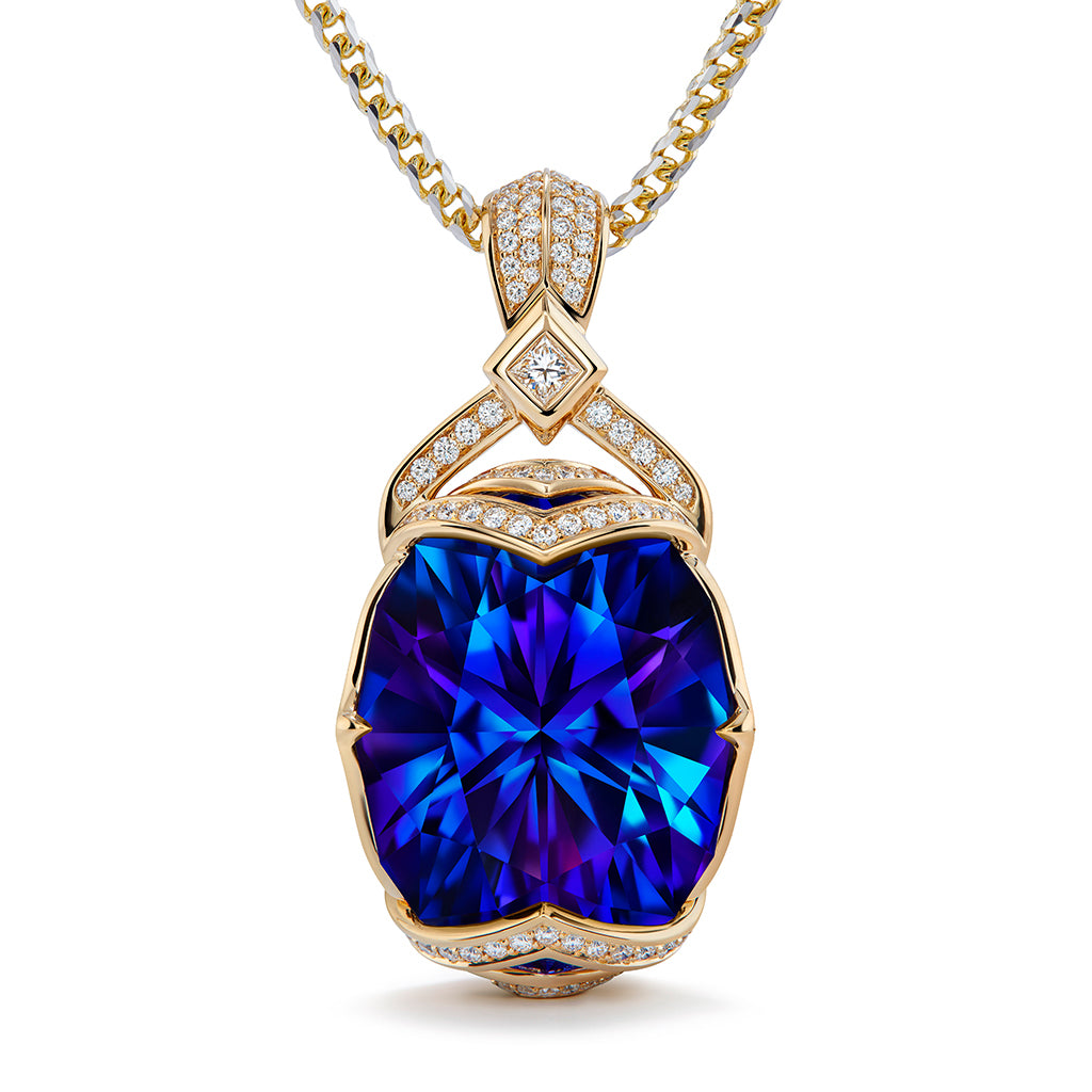 Vivid Blue Tanzanite Necklace with D Flawless Diamonds set in 18K Yellow Gold