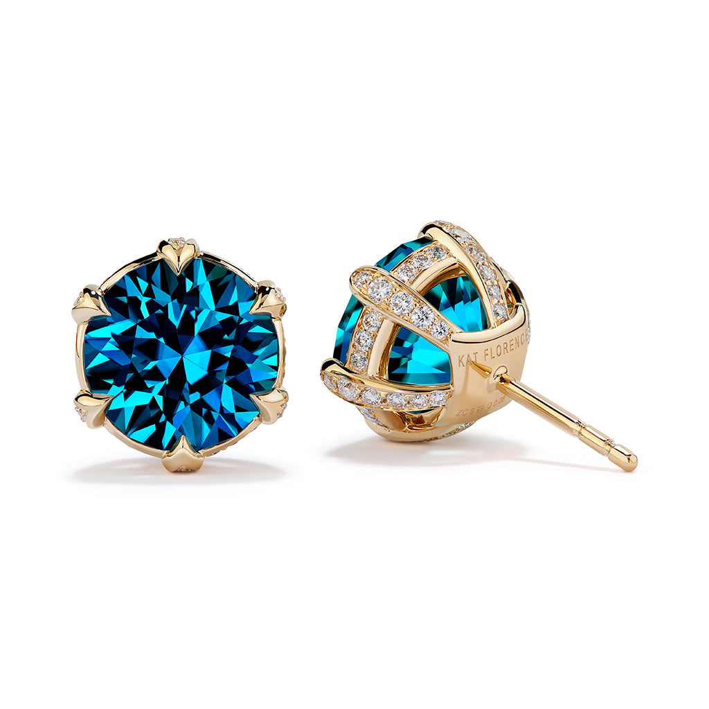 Blue Zircon Earrings with D Flawless Diamonds set in 18K Yellow Gold