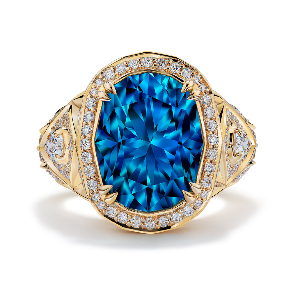 Blue Zircon Ring with D Flawless Diamonds set in 18K Yellow Gold