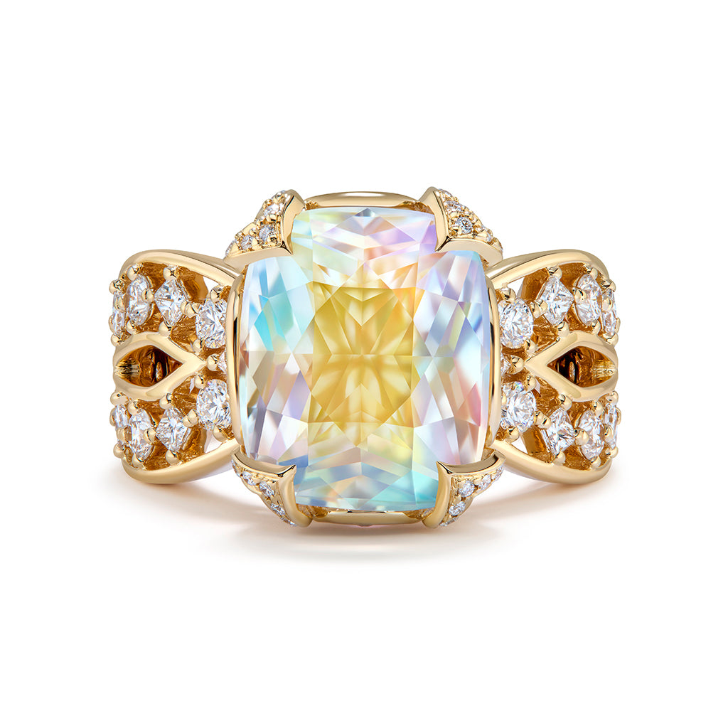 Rainbow Moonstone Ring with D Flawless Diamonds set in 18K Yellow Gold