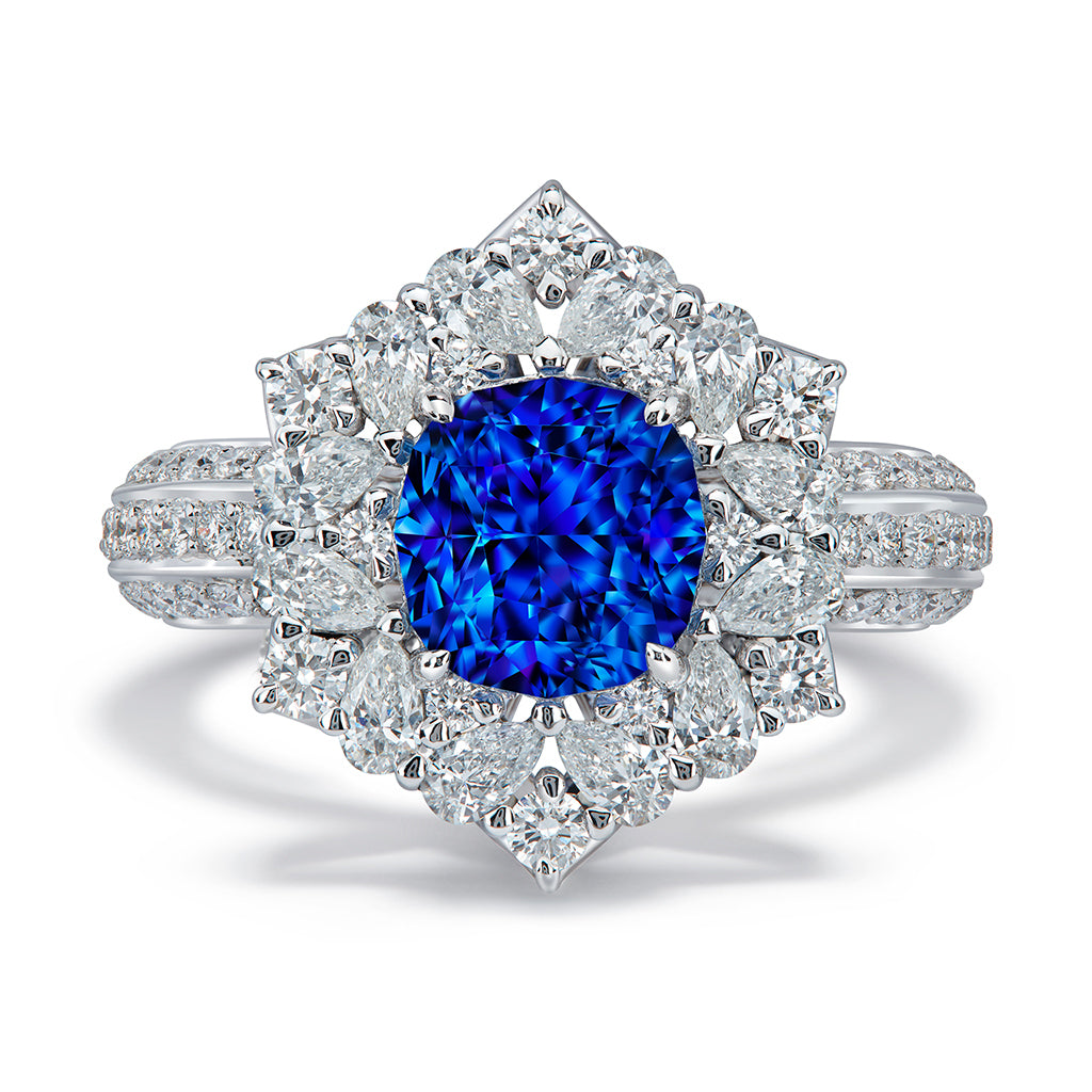 Unheated Ceylon Cornflower Blue Sapphire Ring with D Flawless Diamonds set in 18K White Gold